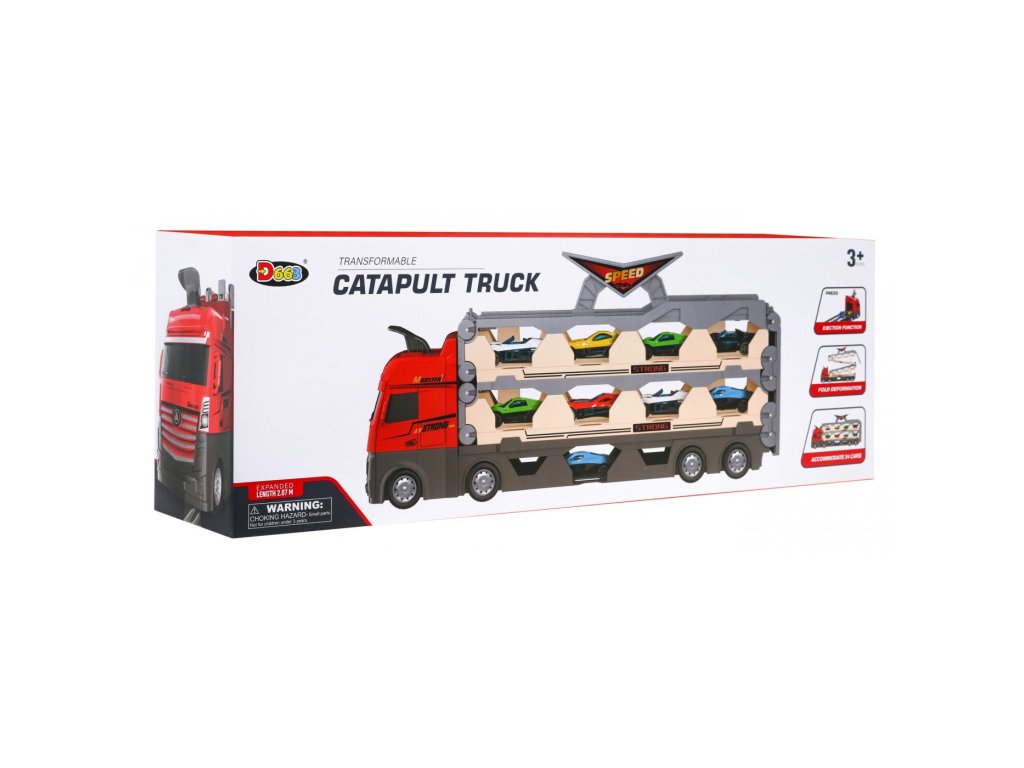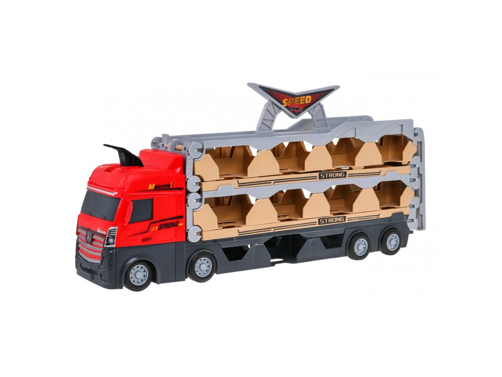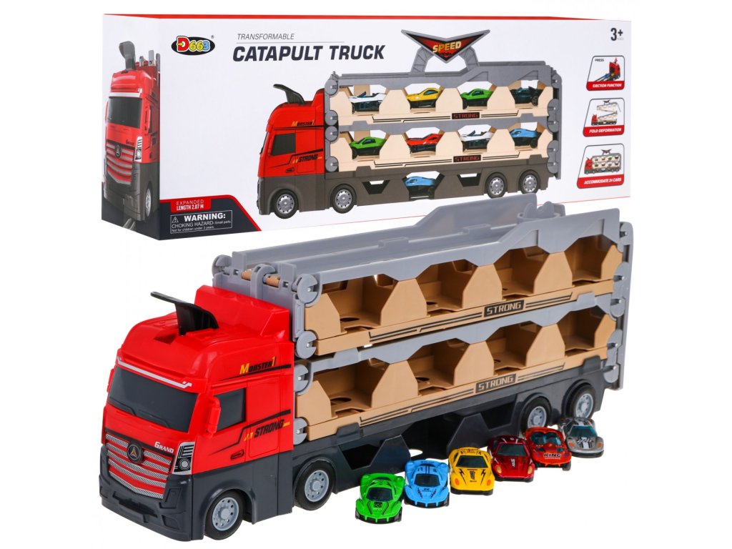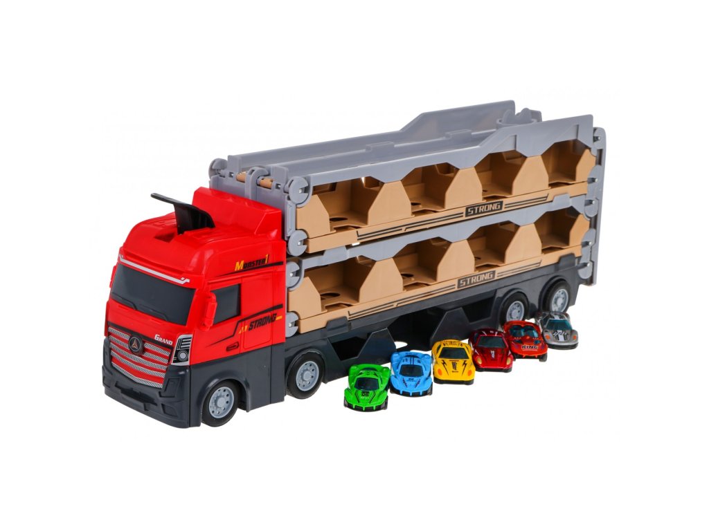 Přenosný kamion s autíčky udělá radost všem malým milovníkům aut. Kamion má gumové pneumatiky a pohon dvou kol. V horní části kamionu je praktické madlo, takže si kamion můžete vzít všude s sebou. Kamion má tři využití - slouží jako garáž pro autíčka, po rozložení se kamion využije jako závodní dráha a katapult pro autíčka.