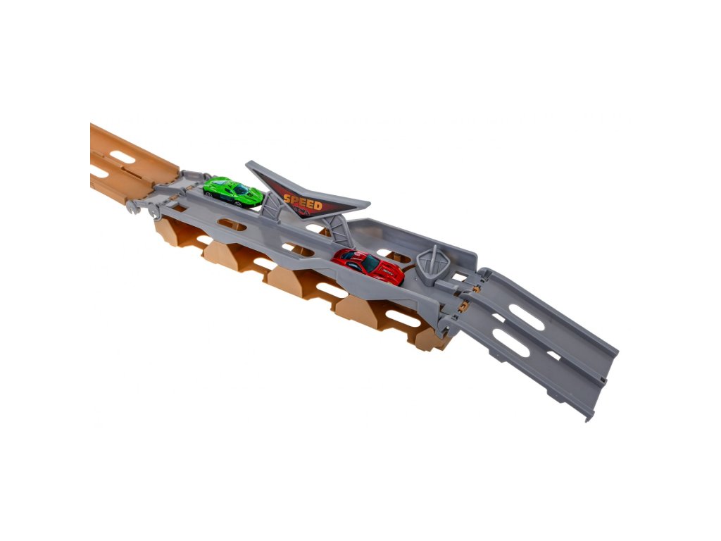 Katapult pro autíčka funguje tak, že umístíte autíčko na nejnižší úroveň a stisknete páku na střeše náklaďáku. Autíčko vystřelí dopředu a projede po celé skládací dráze.