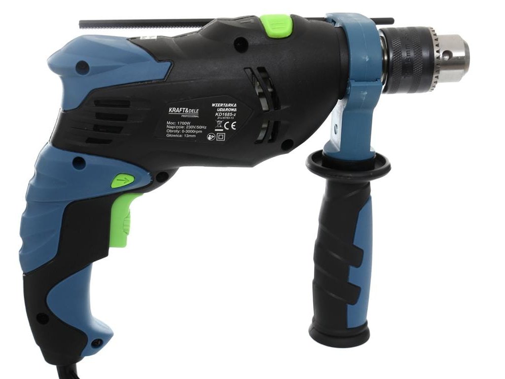Elektrická příklepová vrtačka Kraft&Dele KD1685-Z s výkonem 1700W je určena k příklepovému vrtání do zdiva, betonu a kamene, stejně jako k vrtání do kovu, keramiky, dřeva a plastu. Hlavní rukojeť je vyrobena ze speciálního protiskluzového materiálu, který usnadňuje pevné držení přístroje v ruce. Jedná se o verzi vybavenou dodatečnou boční rukojetí. Hlavička je vyrobena z oceli.