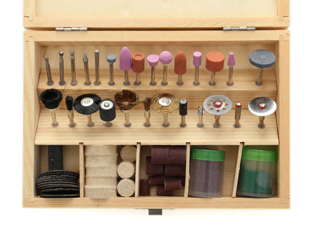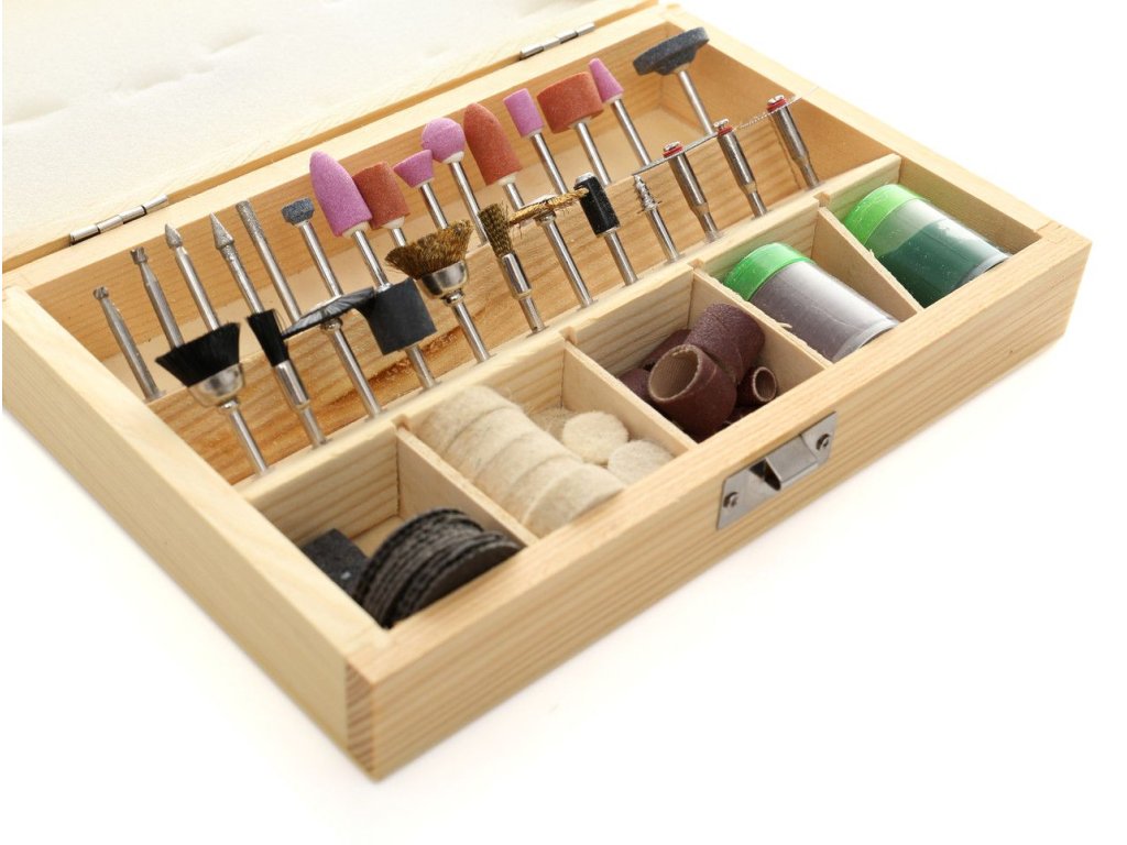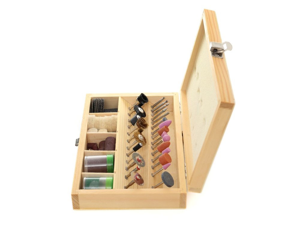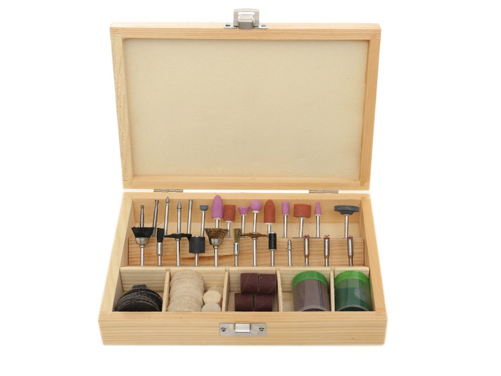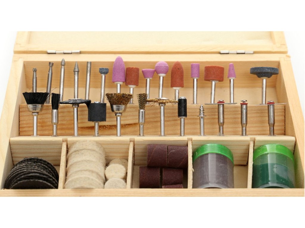 Univerzální sada příslušenství k mini brusce je sestava obsahující 100 kusů různorodého vybavení pro různé účely.
