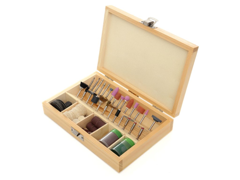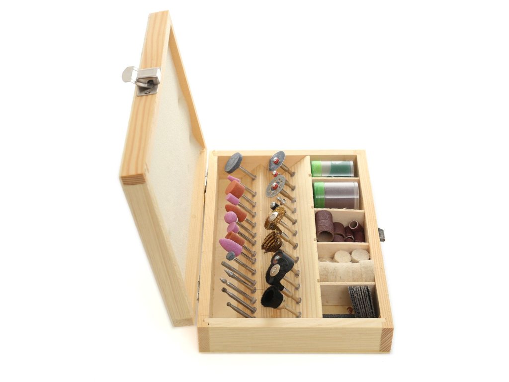 Obsah balení • Karbidové frézy • Brousky • Kartáče z umělé hmoty • Gumové válečky pro uchycení brusného papíru • Ocelové kartáče • Hlava pro korundové kotouče • Hlava pro filcové lešticí kotouče • Brouský blok • Korundové kotouče 32 mm • Brusné papiery 6 mm • Brusné papiery 12 mm • Filc na leštění 25 mm • Filce na leštění 12 mm • Dóza lešticí pasty • Korundové kotouče 24 mm a další... • Originální balení |