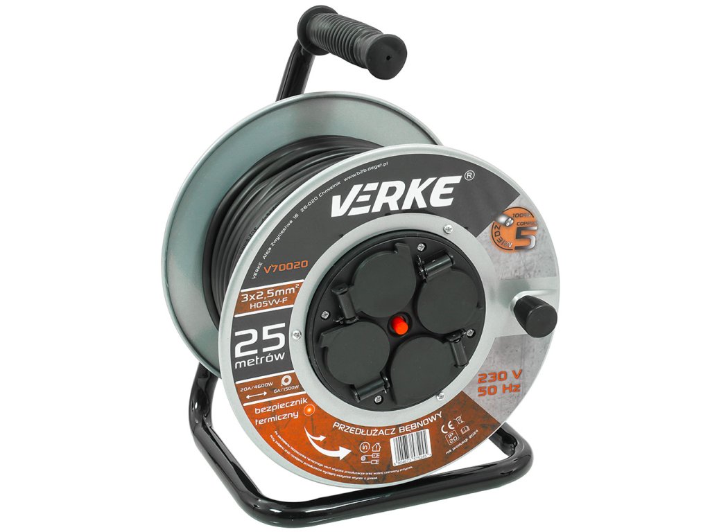 Vysoce kvalitní bubnový prodlužovací kabel o délce 25 m se 4 zásuvkami. Kabel je vyroben z měděných vodičů s průřezem 2,5 mm² každý. Díky tomuto průřezu kabelu lze k prodlužovacím kabelům současně připojit 4 zařízení, což je zvláště užitečné na stavbě nebo v dílně. Kabely jsou pokryty izolací z polyvinylchloridu, která se vyznačuje vysokou odolností proti mechanickému poškození, atmosférickým vlivům a chemikáliím. Prodlužovací kabel je vybaven termální pojistkou.