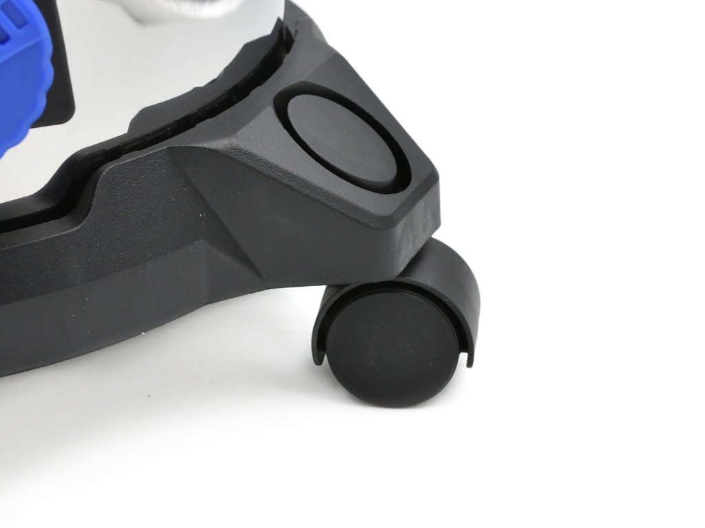 Vysavač také disponuje čtyřmi otočnými kolečky, která zajišťují snadnou manipulaci a mobilitu zařízení. Plovákový bezpečnostní ventil slouží k ochraně při mokrém vysávání a výpustný ventil umožňuje snadné vypouštění špinavé vody. Teleskopická regulace sací trubice dále přispívá k pohodlnému používání.