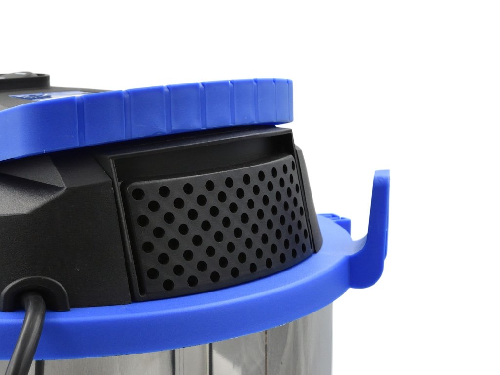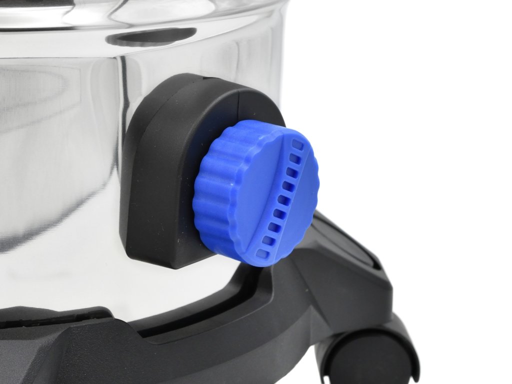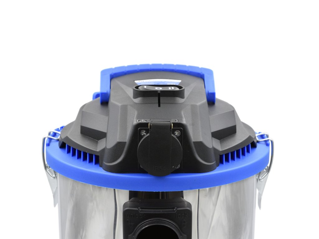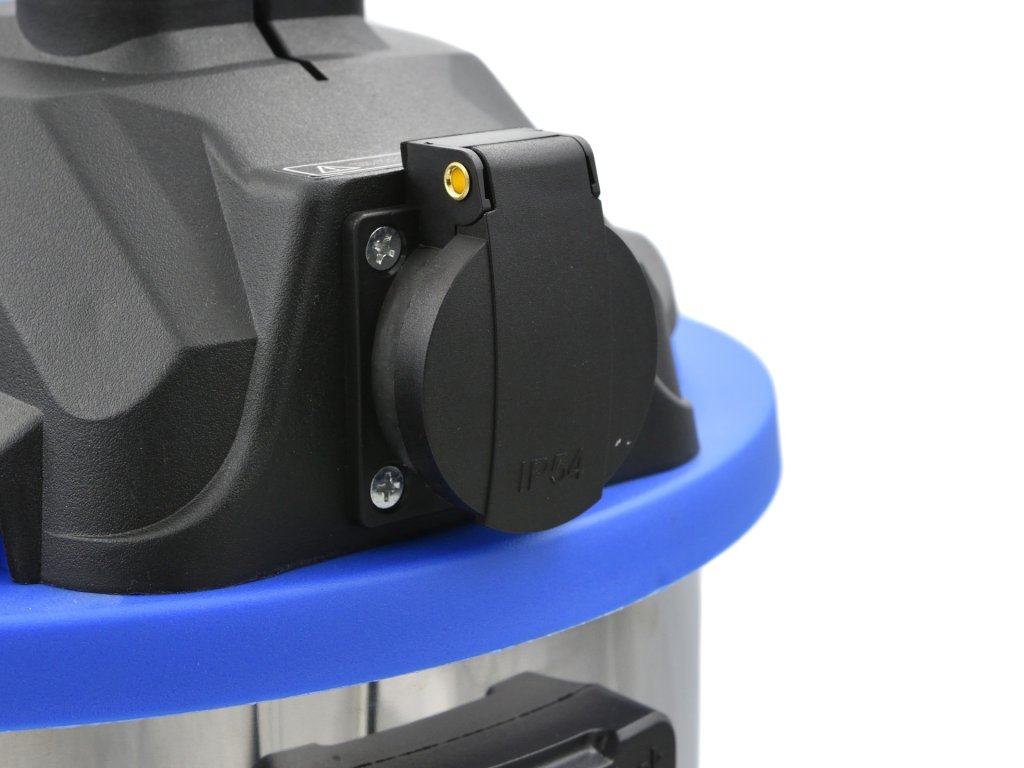 Zařízení je vybaveno praktickou zásuvkou, která umožňuje připojení elektrického nářadí s maximálním výkonem až 2000W. Třípolohový vypínač umožňuje snadné přepínání mezi dvěma pracovními režimy, a nádoba s objemem 25 litrů je vyrobena z pevné nerezové oceli. Díky funkci foukání můžete snadno vyfoukat nečistoty z těžko dosažitelných míst.