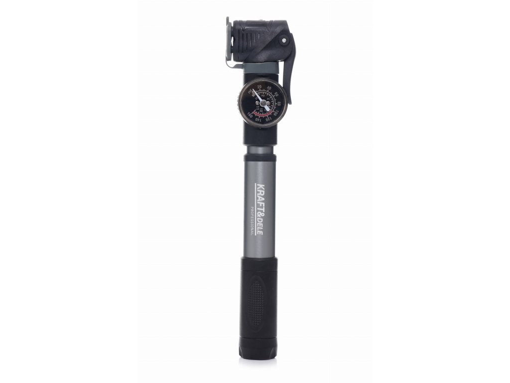 Ruční pumpa na kolo s manometrem značky Kraft&Dele, model KD11823, určená k rychlému nafouknutí nebo dofouknutí kol v kole. Dvojitá hlava je vhodná pro všechny typy ventilů AV (Schrader), DV (Dunlop) a FV (Presta).