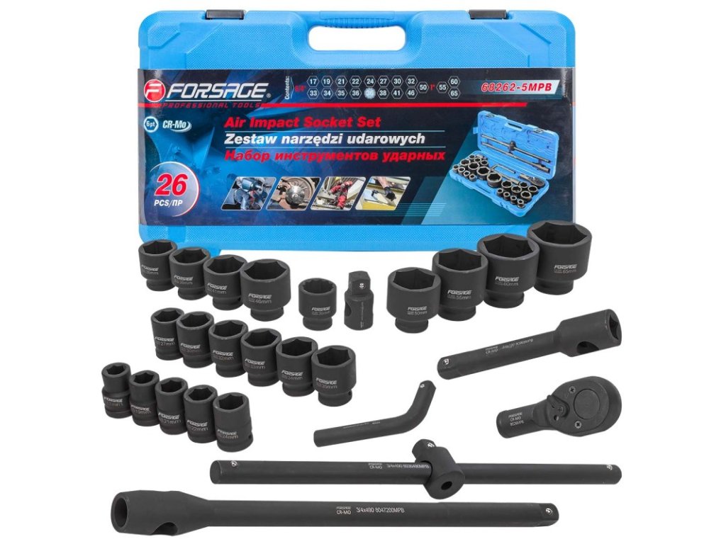 - Násadce 6-hranné 3/4" - 17 ks: 17 mm, 19 mm, 21 mm, 22 mm, 24 mm, 27 mm, 30 mm, 32 mm, 33 mm, 34 mm, 35 mm, 36 mm (36 mm - 12-hran), 38 mm, 41 mm, 46 mm, 50 mm