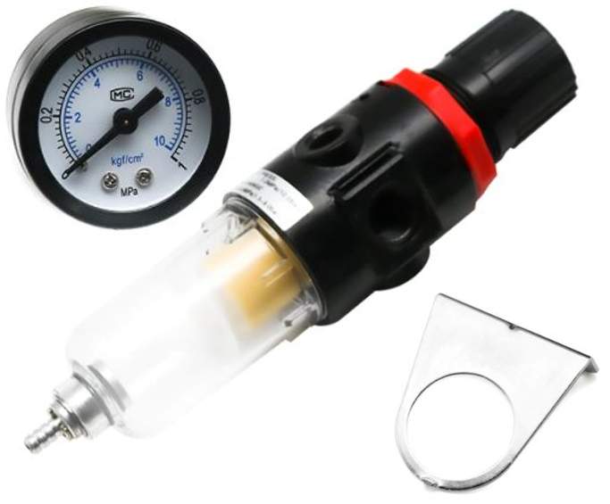 Redukční ventil pro pneumatická zařízení je vybaven kompletním blokem pro přípravu vzduchu. Přesný manometr s dvojitou stupnicí bar a PSI v ochranném sklíčku umožňuje trvalou kontrolu tlaku.