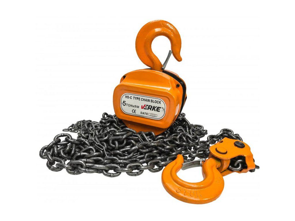Řetězový zvedák značky Verke je vybaven ručním pohonem a převodovkou, která umožňuje zvedání břemen do hmotnosti 5000 kg. Řetěz je vyroben z vysoce kvalitní oceli. Články jsou spojovány metodou odporově-jiskrového svařování, což zajišťuje odpovídající kvalitu a odolnost jednotlivých článků. Zvedák je vybaven bezpečnými háky s blokádou, která zabraňuje vyklouznutí nákladu.
