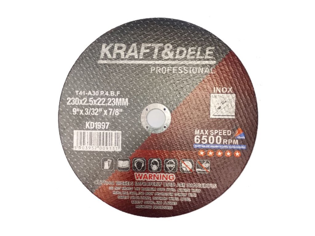 Profesionální řezné kotouče značky Kraft&Dele slouží k řezání kovových předmětů pomocí úhlové brusky. Obsahují brusný materiál vázaný syntetickou pryskyřicí a jsou vyztuženy skelným vláknem.