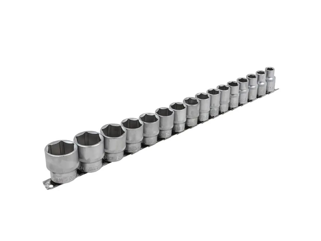 Rockforce sada nástrčných hlavic 1/2" 6hranných, 16 ks na liště, Cr‑V