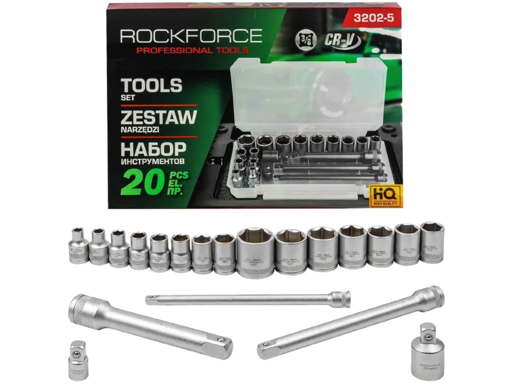 ROCKFORCE Sada nástrčných hlavic 3/8", 20 ks, s adaptéry a prodlužkami