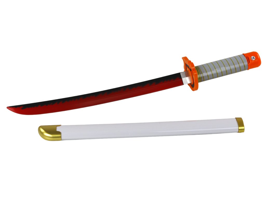 Meč vyzařuje energii oranžové barvy na rukojeti a červeno-černý vzor na čepeli dodává zbrani charakteristický vzhled. Pouzdro slouží nejen jako ochranný prvek, ale umožňuje i bezpečné uložení meče, což z něj činí důležitou součást výbavy mladého hrdiny.