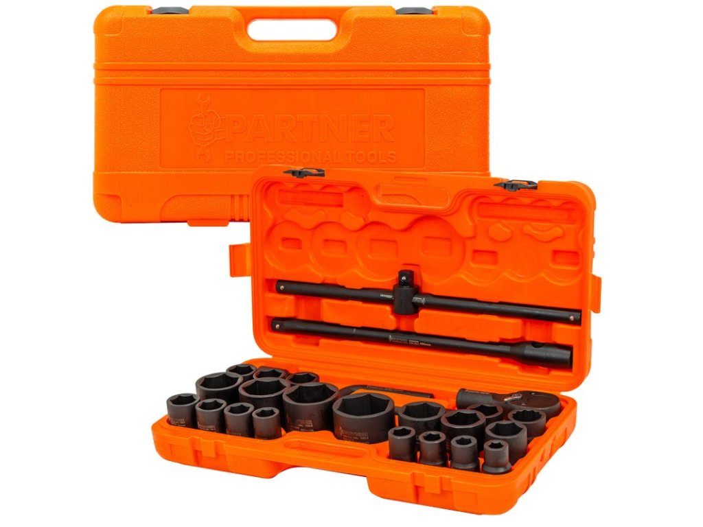Profesionální sada nástrčných klíčů 3/4" + 1". Ideální pro velká nákladní vozidla i zemědělské stroje, vyrobená z pevných materiálů, což se projevuje v jejich odolnosti. Nezbytná v každé automobilové dílně — nástrčné hlavice této velikosti pomohou při opravách kamionů nebo zemědělských strojů. Ideální při povolování nebo dotahování velkých šroubů. Všechny hlavice a redukce jsou uloženy v praktickém kufříku. Sada obsahuje 26 dílů. Kufřík zajišťuje bezpečný transport a brání samovolnému otevření.