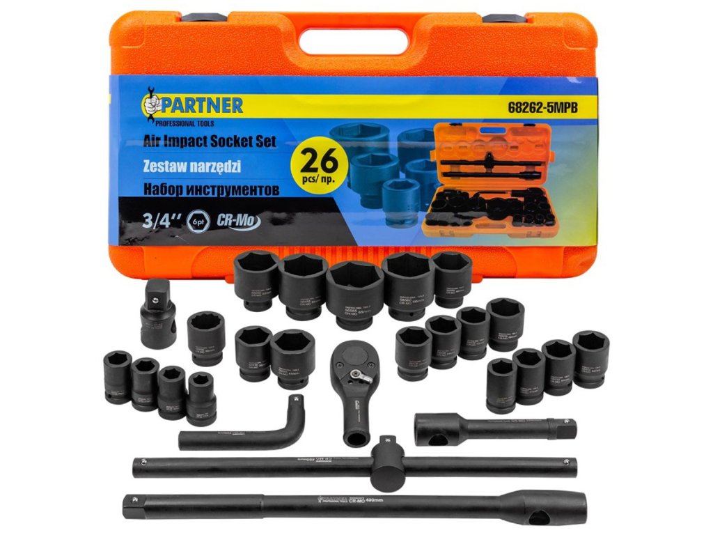 Sada 26 rázových nástrčných hlavic 3/4" 17–65 mm, 6hranné, v kufříku
