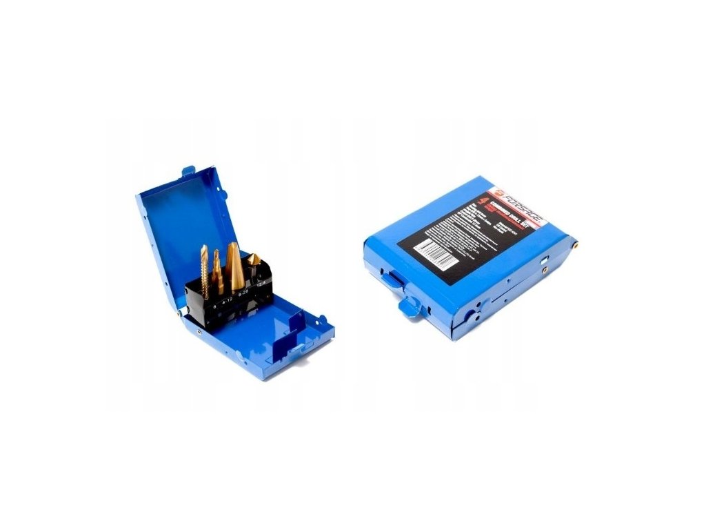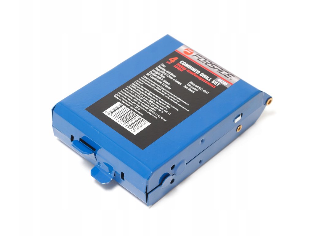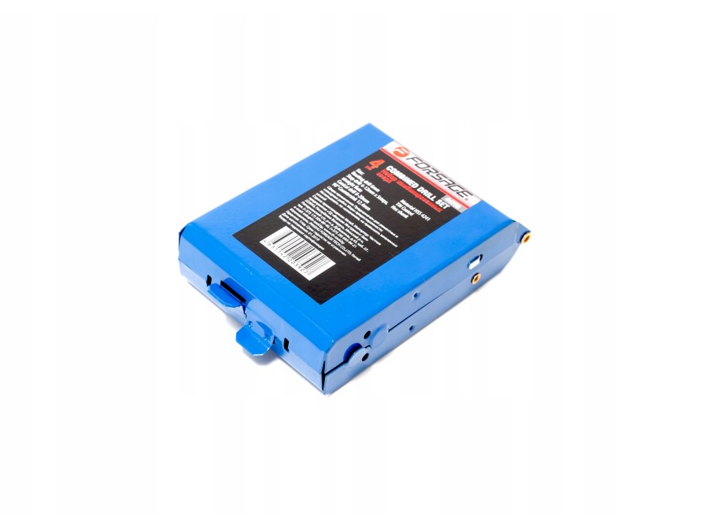 Sada univerzálních vrtáků značky Forsage v kovovém pouzdře.