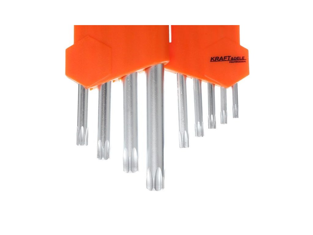 Sada šroubováků TORX značky KRAFT&DELE. Imbusy jsou vyrobeny z kvalitní chrom-vanadiové oceli CrV, která se vyznačuje pevností a pružností. Klíče jsou oboustranné.