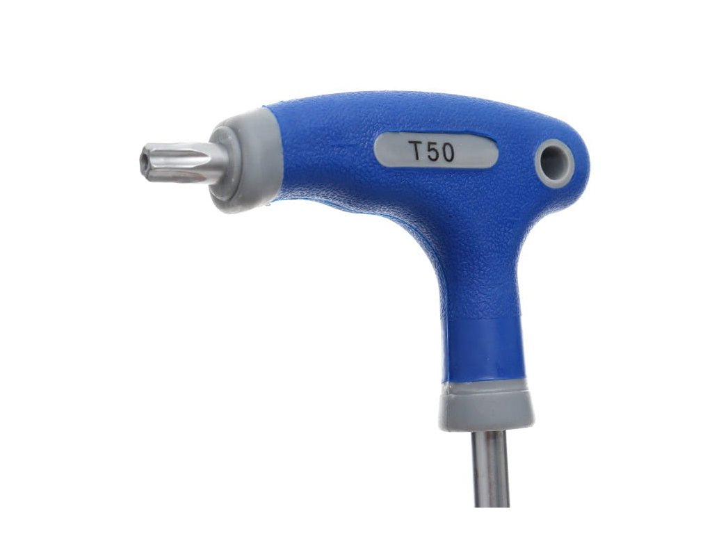 Rukojeť je vyrobena z plastu a pokryta gumovou vrstvou, která zajišťuje pevný úchop v ruce.