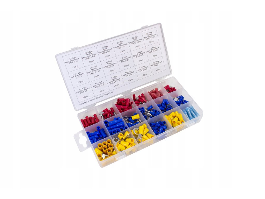 - 260 ks konektorů v různých velikostech, rozdělené a označené