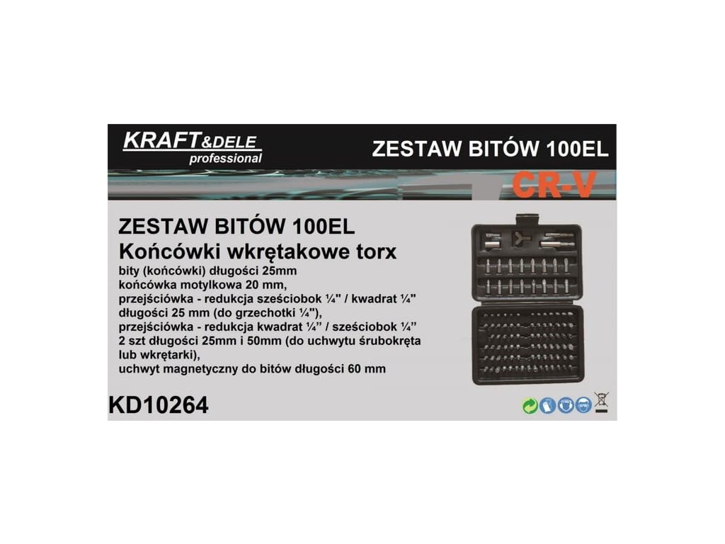 Sada bitů do šroubováku KD10264 obsahuje 100 kusů, sestavených s ohledem na různorodé použití při montážních a opravárenských pracích. Sada zahrnuje redukce pro ráčnu 1”, magnetický držák do šroubováku a bity (hroty) o délce 25 mm. Součástí sady jsou také různé doplňky, jako je křidélkový hrot, redukční adaptéry šestihran 1" / čtverec 1", magnetické držáky a široký výběr plochých, křížových, imbusových, torx, hvězdicových, čtvercových, servisních „vidličkových“, spline a servisních typů C bitů.