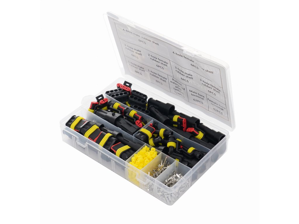 Sada hermetických elektrických konektorů značky Kraft&Dele, model KD10480, je vhodná pro nejběžnější průměry elektrických vodičů. Nejčastěji se používají v automobilovém průmyslu, mimo jiné pro senzory a automobilová zařízení. Svůj význam však mají také v elektrických sítích a domácích spotřebičích.