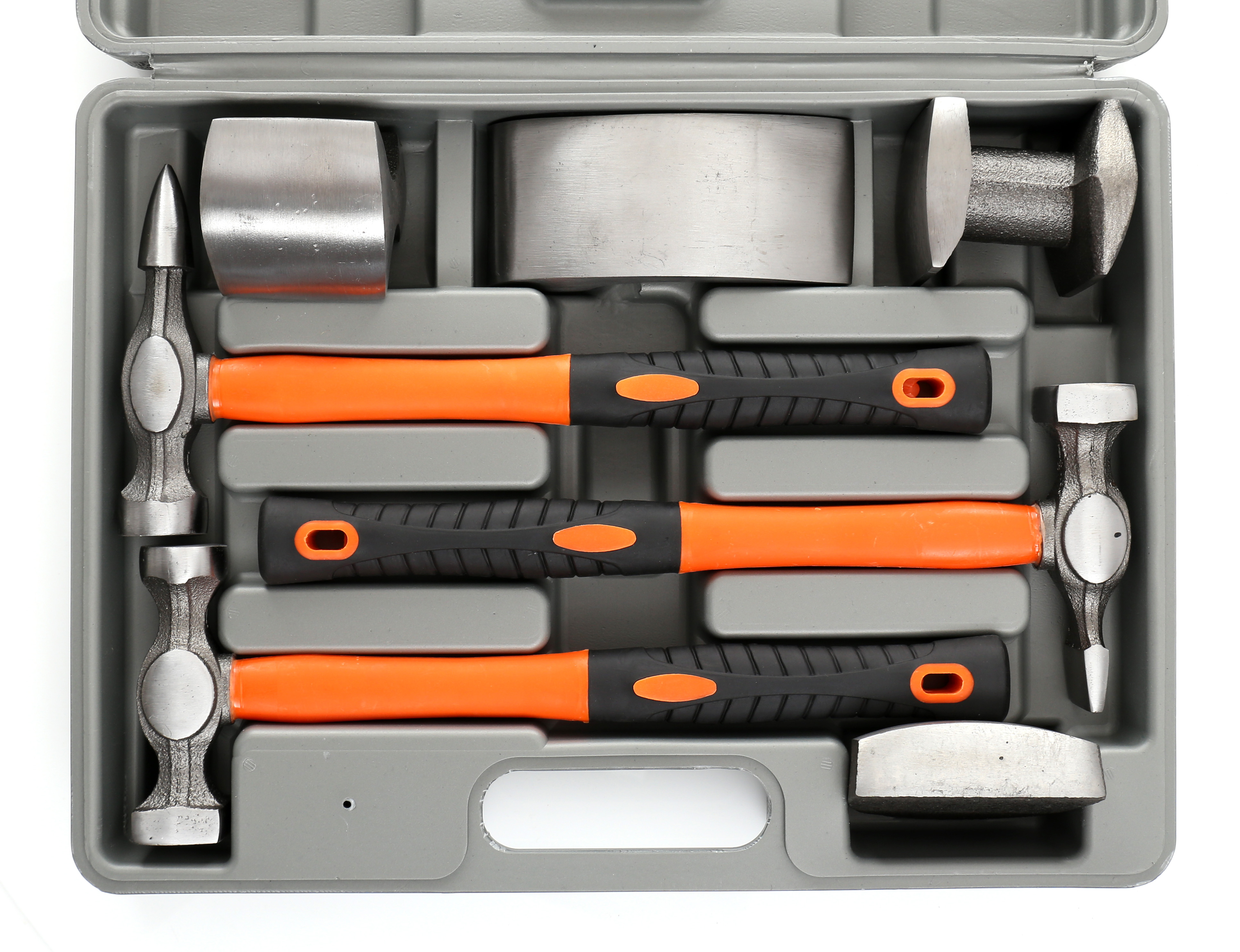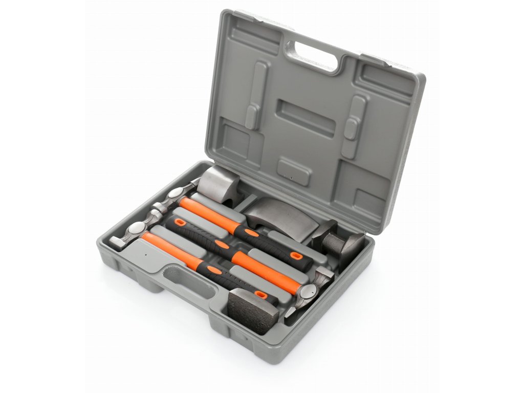 Kompletní sada nářadí pro klempířské práce a opravy promáčklých karoserií. Pracovní plochy nástrojů umožňují vytvářet různé tvary v opracovávaném materiálu.