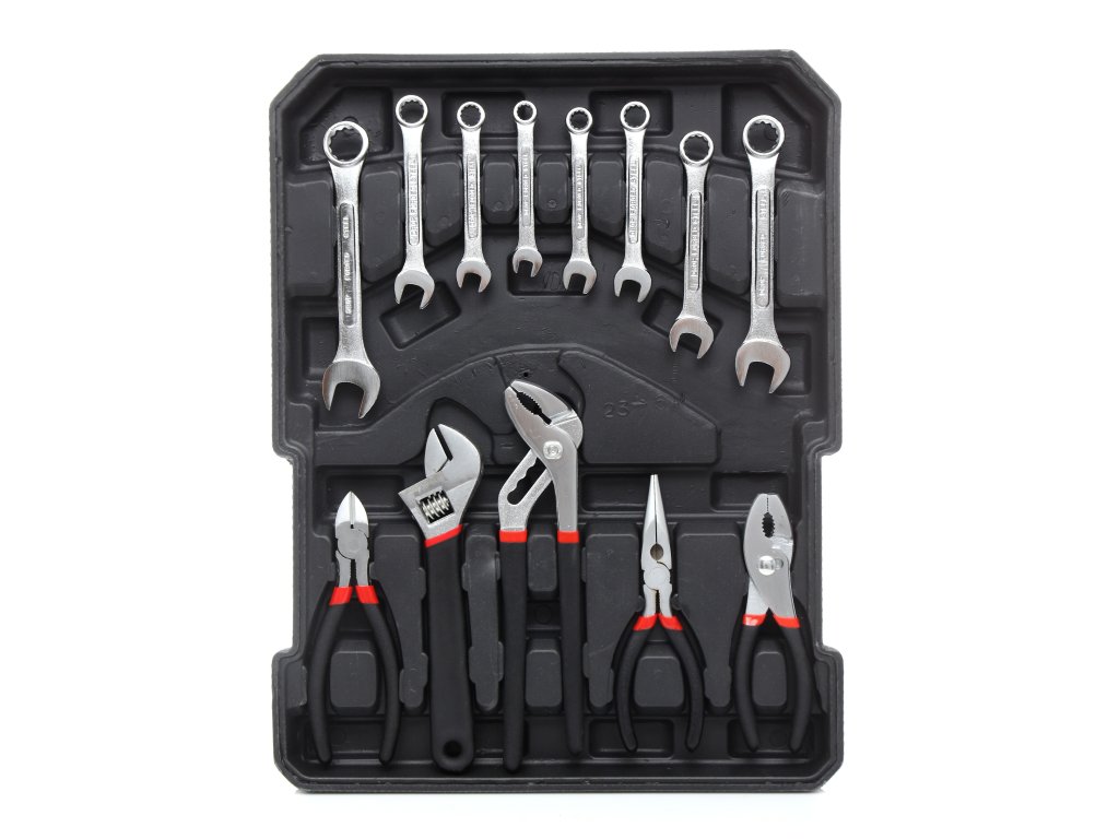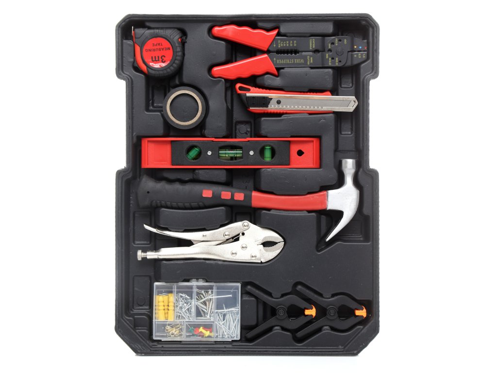 klíče ploché, nástrčné, ráčnu, kladivo, sadu kleští, vodováhy, svorky, měřicí pásmo, izolační pásku, nůž, sadu hřebíků a šroubů, a také šroubováky a bity.