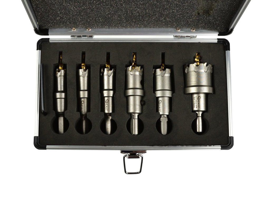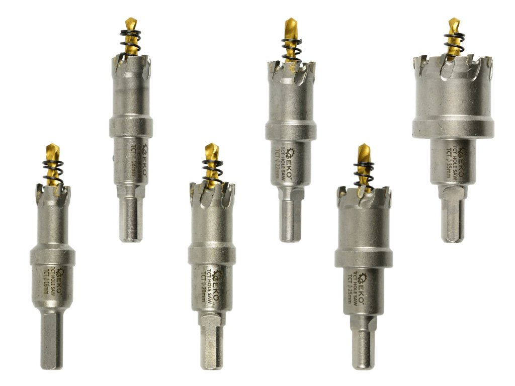 Sada 6 ks korunkových vrtáků TCT na kov je ideální pro vrtání otvorů v rozsahu průměrů 16-35 mm. Každý vrták je opatřen ostřím z tvrdokovu, které nabízí vyšší tvrdost a odolnost vůči vysokým teplotám oproti rychlořezné oceli HSS. Tato sada je navržena pro vrtání do oceli, litiny, neželezných kovů, dřeva, plastů a dalších materiálů.