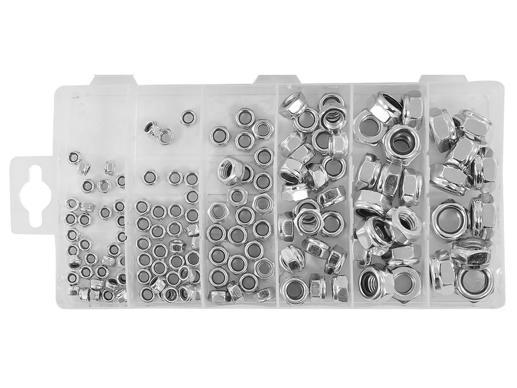 Sada 146 kusů metrických matic s pojistkou proti samovolnému uvolnění. V sadě najdete velikosti: M4, M5, M6, M8, M10, M12. Vše je uloženo v praktickém balení typu "třídicí box".