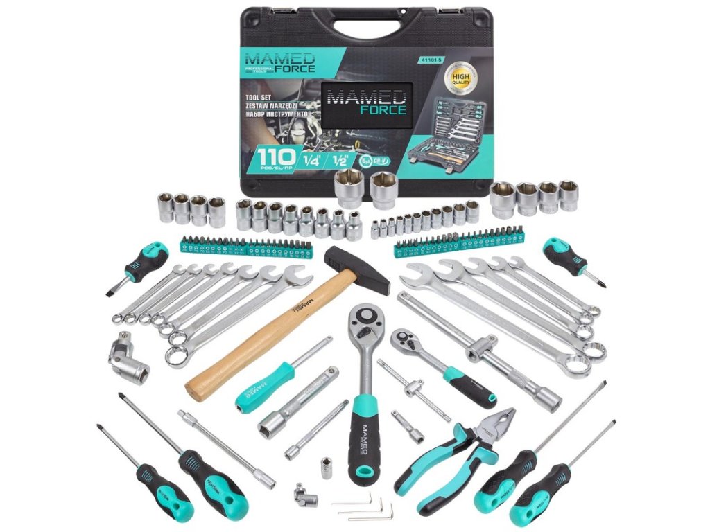 Sada nářadí sestávající ze 110 dílů je ideálním řešením pro profesionální mechaniky i nadšence automobilových oprav. Balíček obsahuje rozmanité nástroje, které uspokojí široké spektrum potřeb. V sadě jsou nástrčné hlavice s čtvercovým upínáním 1/4" a 1/2".