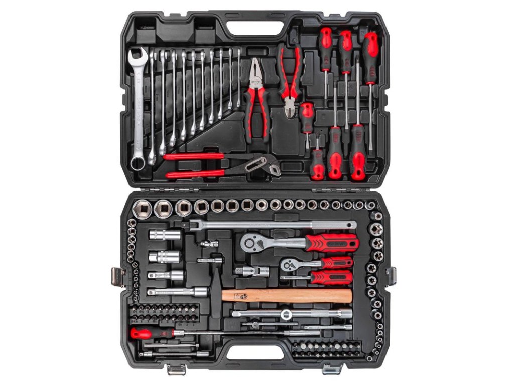 Sada nářadí v kufru, nástrčné hlavice, klíče, ráčna 1/4" a 1/2" – 124 ks