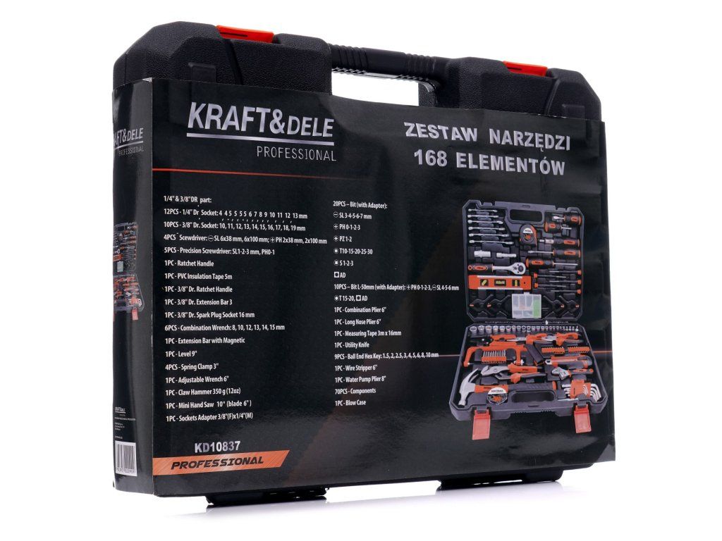 Nápaditě rozšířená sada nářadí značky Kraft&Dele s označením KD10837. Nářadí se vyznačuje pevnou konstrukcí, odolnými materiály a praktickým kufříkem, ve kterém má každý nástroj své místo.