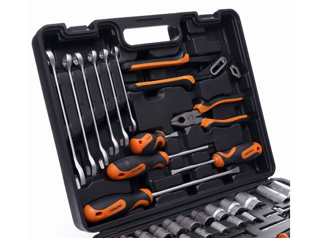 Kufřík z odolných plastových materiálů umožňuje udržet pořádek a snadný přenos nářadí. Každý nástroj má své vyhrazené místo, kde se snadno najde potřebná velikost klíče.
