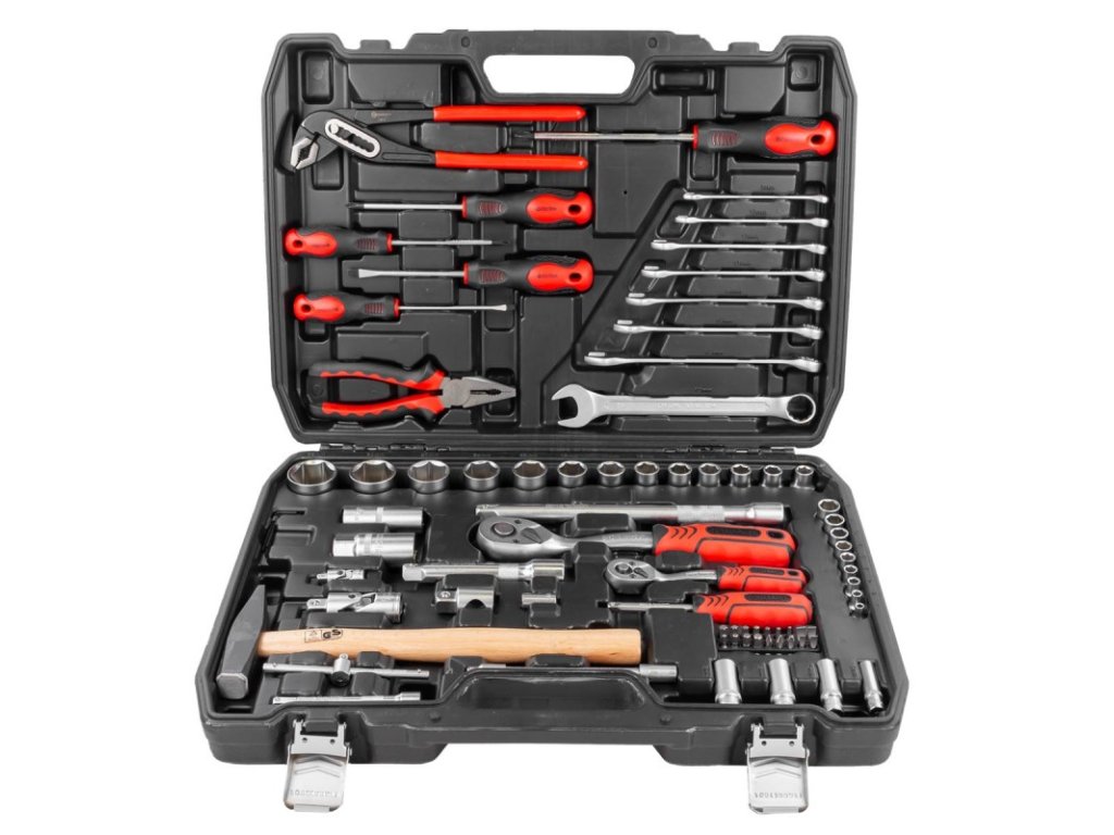 Sada nářadí je uložena v kufru, což usnadňuje jejich skladování, přepravu a organizaci. Díky tomu má uživatel jistotu, že všechny nástroje jsou vždy na svém místě a připravené k použití.