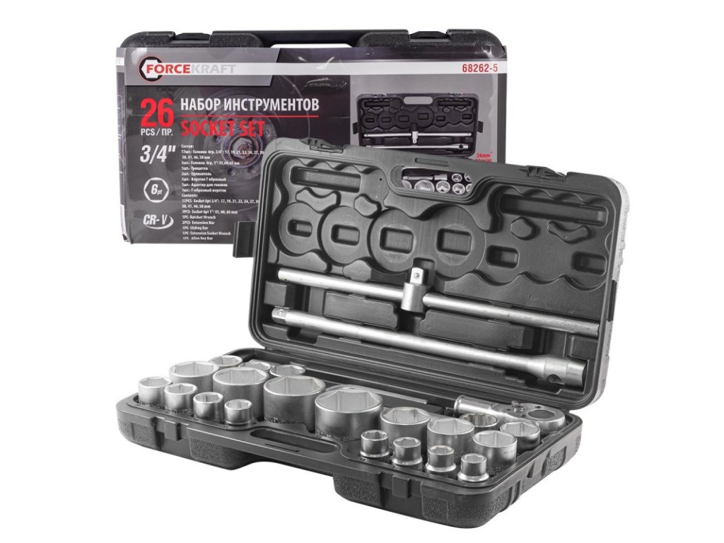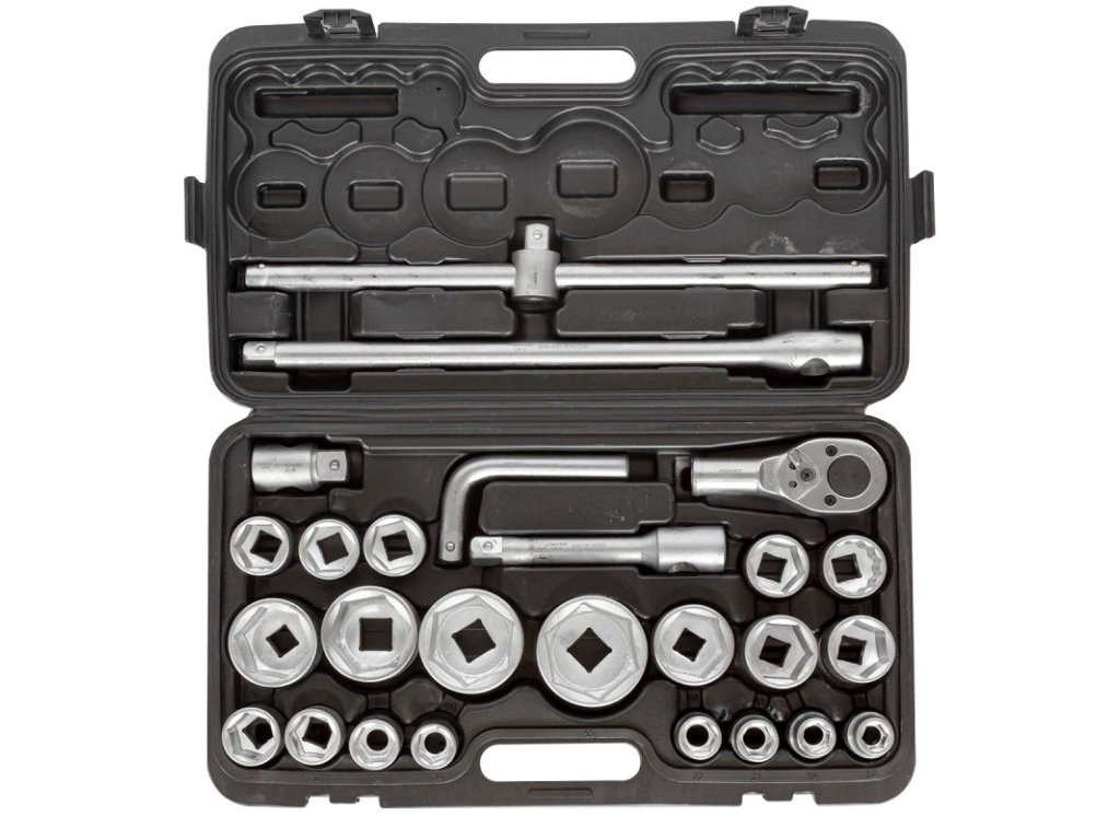 Sada obsahuje 26 dílů. Všechny nástrčné hlavice a adaptéry jsou uloženy v praktickém plastovém kufříku, který zajišťuje bezpečný transport bez rizika samovolného otevření.