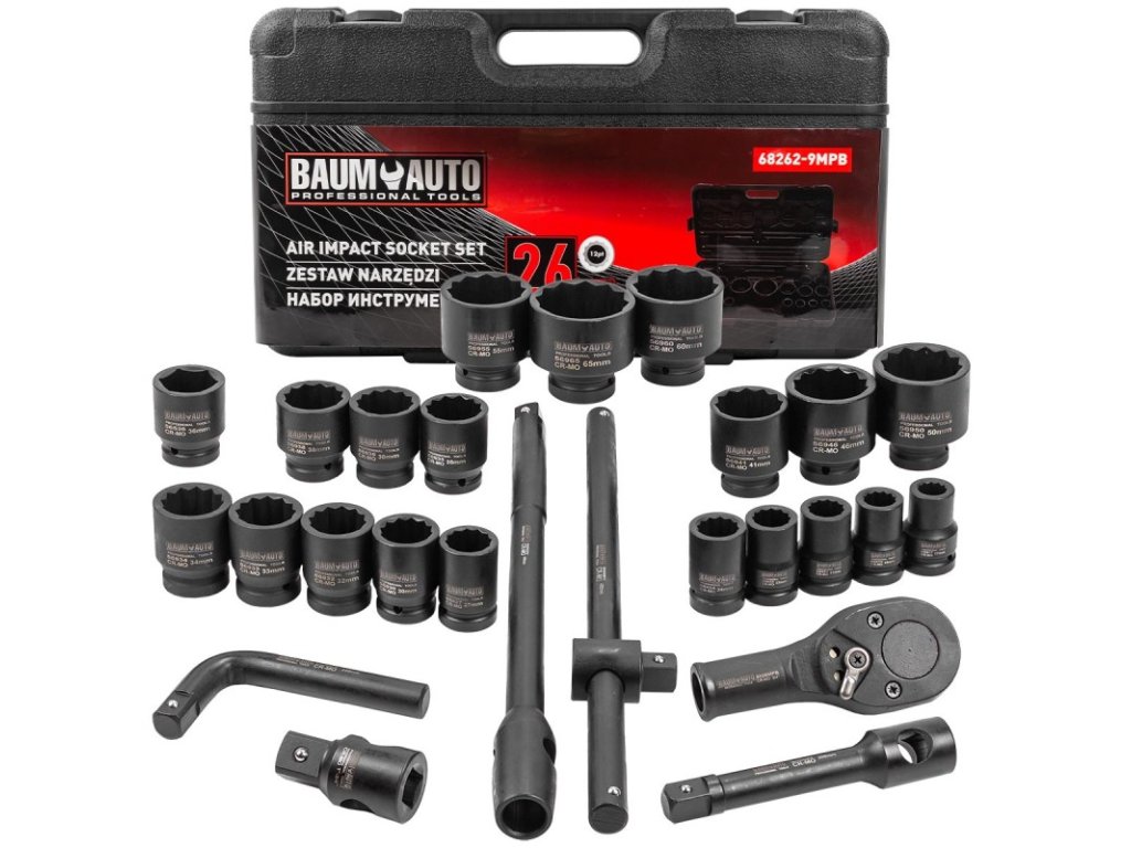 Sada rázových 12hranných hlavic 3/4", 17–65 mm, 26 ks, v kufru