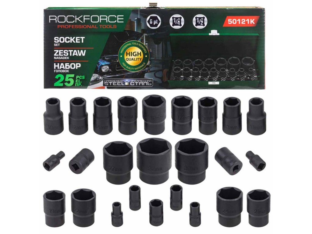 Sada rázových hlavic 1/2" a 1/4", 4–32 mm, šestihranné, 25 ks v kufru