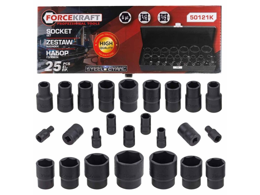 Sada rázových nástrčných hlavic 1/2" a 1/4", 4–32 mm, 6hranné, 25 ks, v kufru