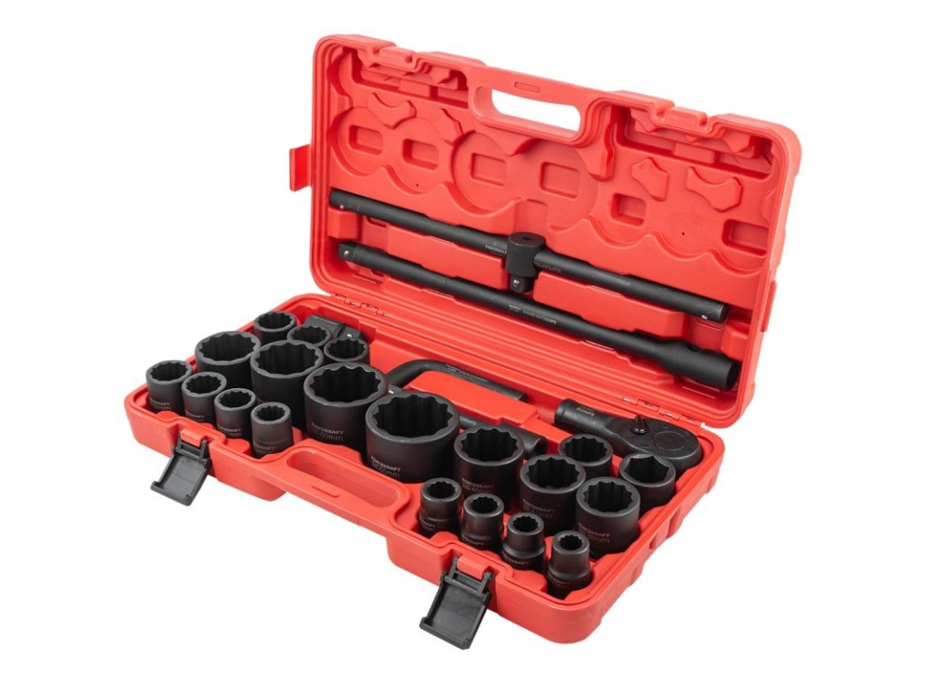 - 12hranné nástrčné hlavice 3/4" - 17 ks: 17 mm, 19 mm, 21 mm, 22 mm, 24 mm, 27 mm, 30 mm, 32 mm, 33 mm, 34 mm, 35 mm, 36 mm (36 mm - 6hranná), 38 mm, 41 mm, 46 mm, 50 mm