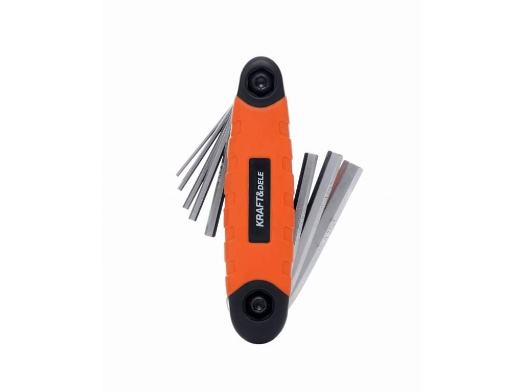 Sada skládacích imbusů značky Kraft&Dele, model KD11934, má speciální konec s otvorem přizpůsobeným ke spolupráci se šrouby typu HEX.