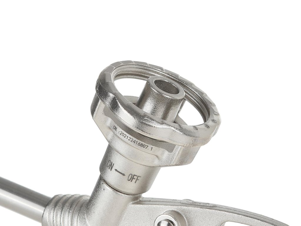 - Ventil a jehla z nerezové oceli, které zajišťují přesnou a rovnoměrnou aplikaci pěny.