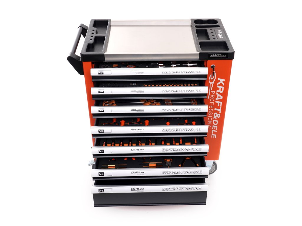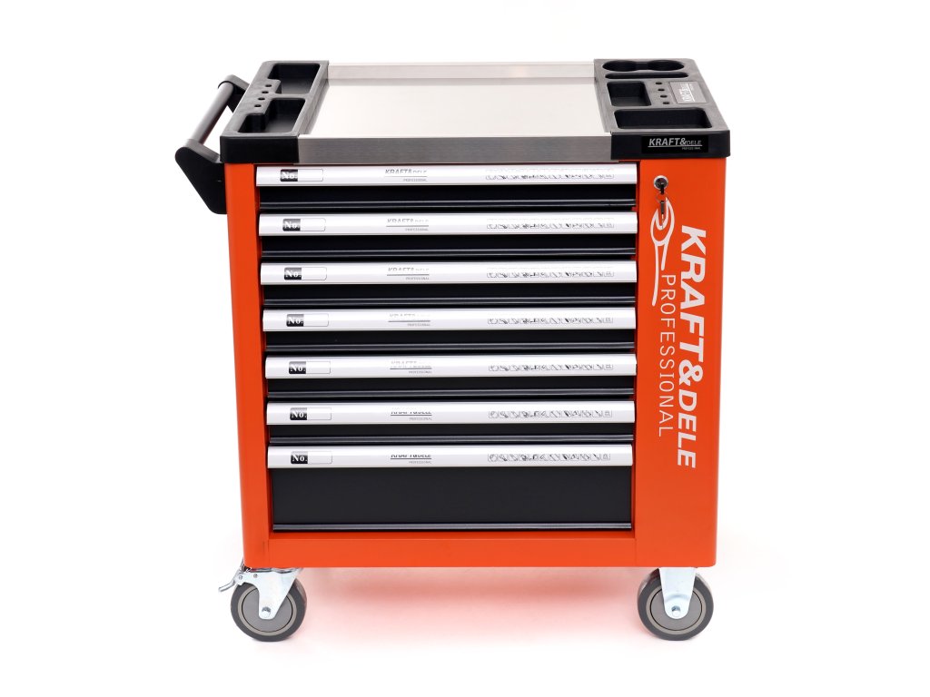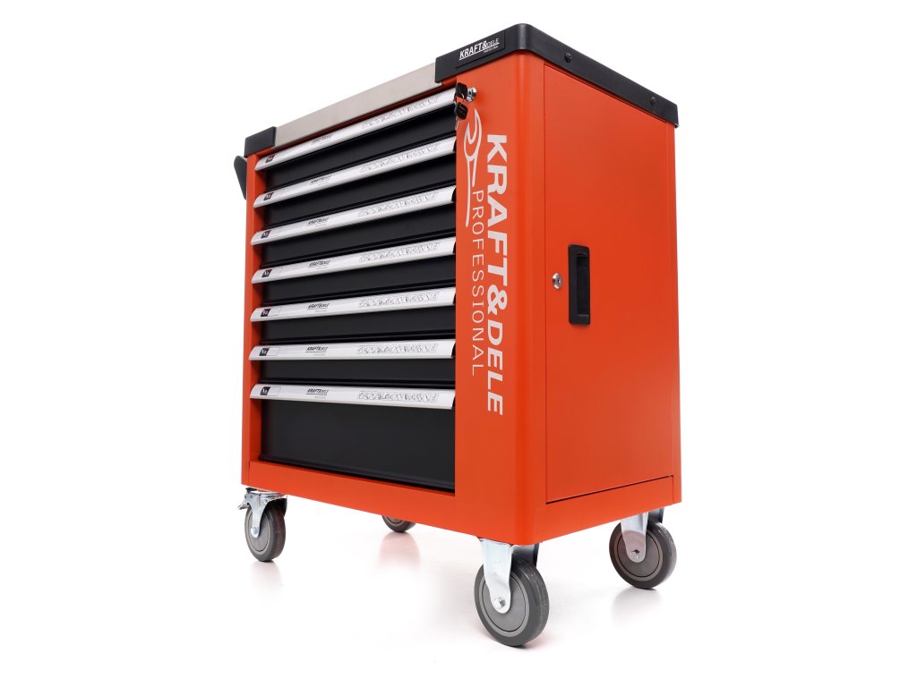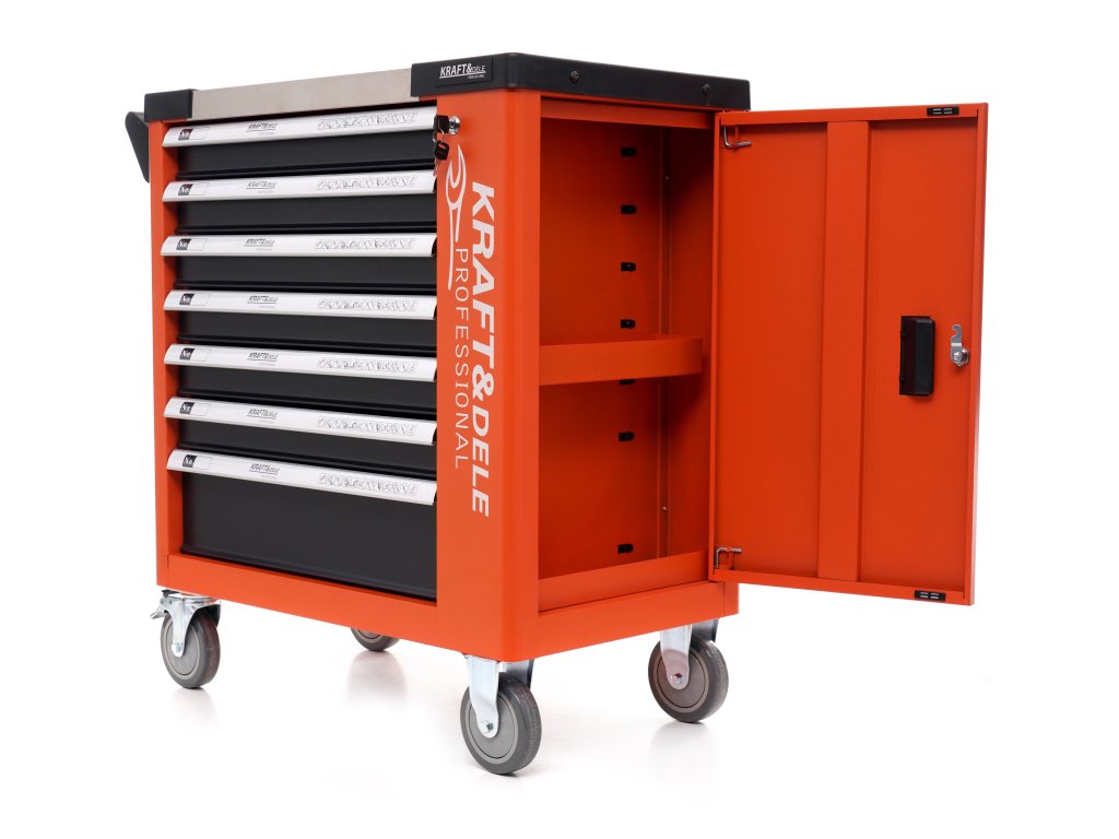 Skříňka s nástroji značky Kraft&Dele umožňuje udržet pořádek na pracovišti. Zajistí lepší organizaci a komfort během různých prací. Skříňka / vozík má 6 zásuvek naplněných nářadím renomované značky. Jedna zásuvka je prázdná. Nákupem naší skříně zkrátíte čas práce tím, že budete mít mnoho nástrojů na jednom místě.