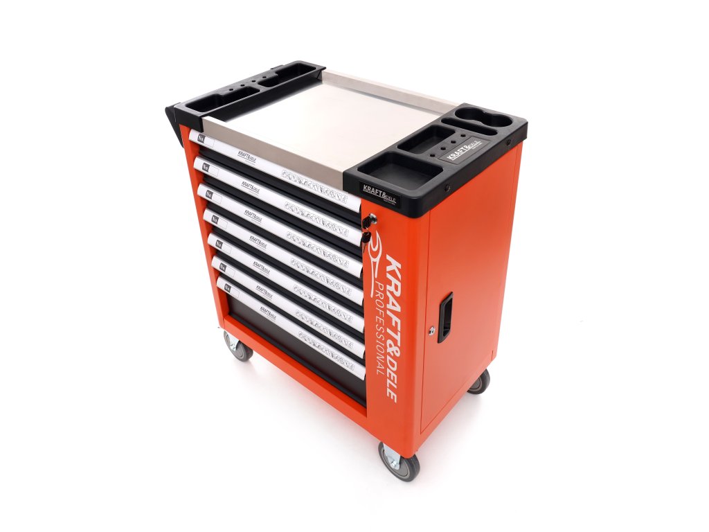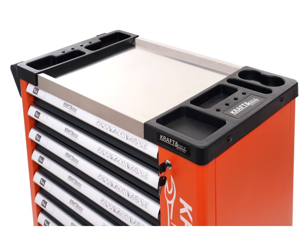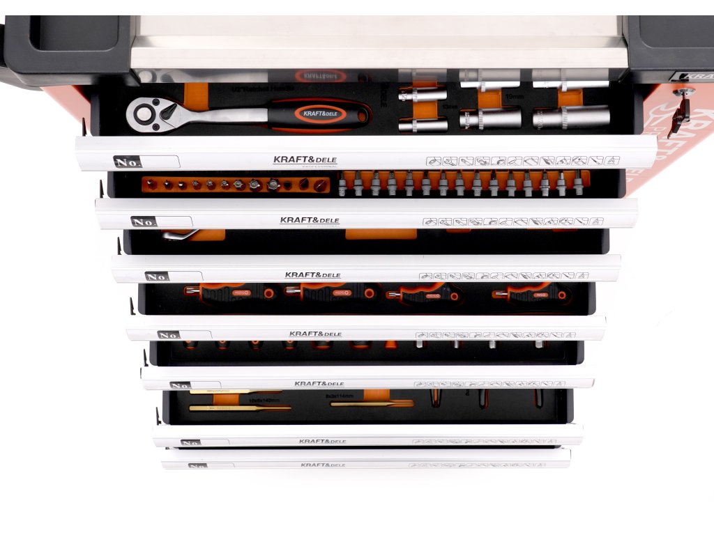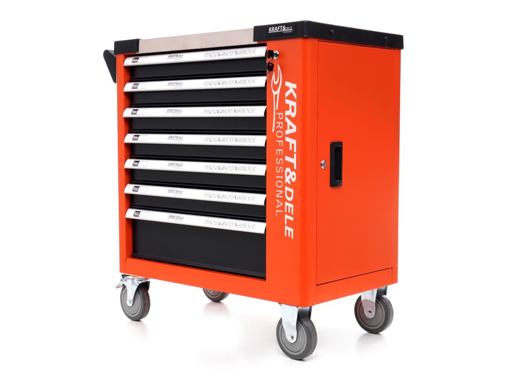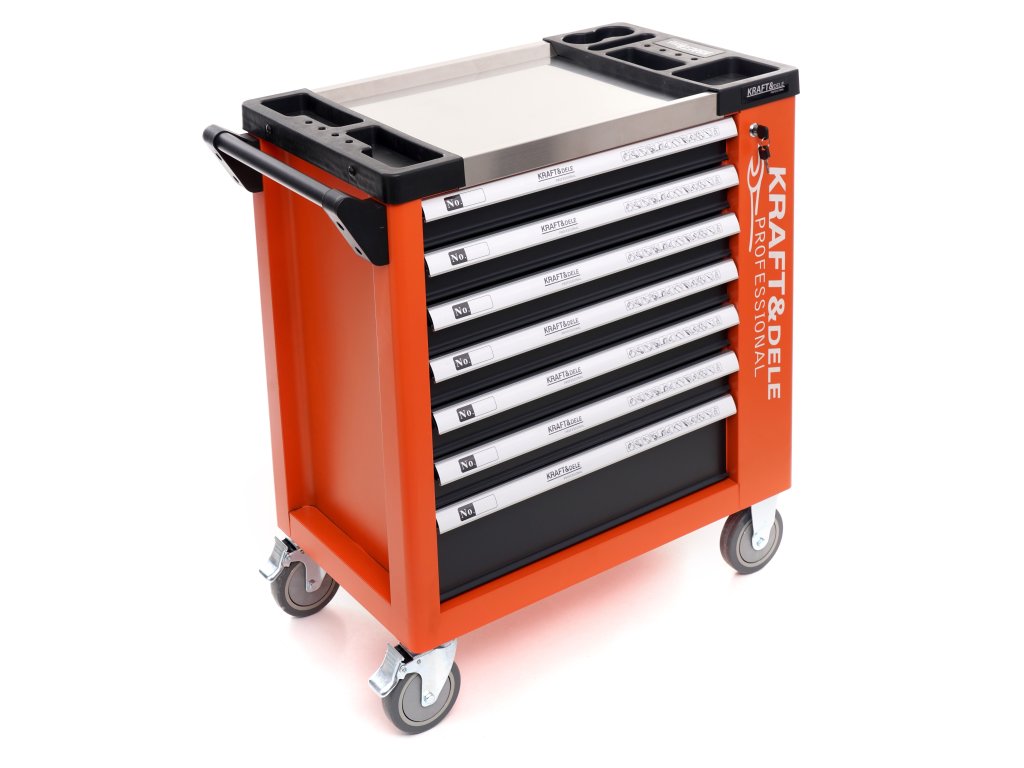 Skříňka s nástroji značky Kraft&Dele umožňuje udržet pořádek na pracovišti. Zajistí lepší organizaci a komfort během různých prací. Skříňka / vozík má 6 zásuvek naplněných nářadím renomované značky. Jedna zásuvka je prázdná. Nákupem naší skříně zkrátíte čas práce tím, že budete mít mnoho nástrojů na jednom místě.