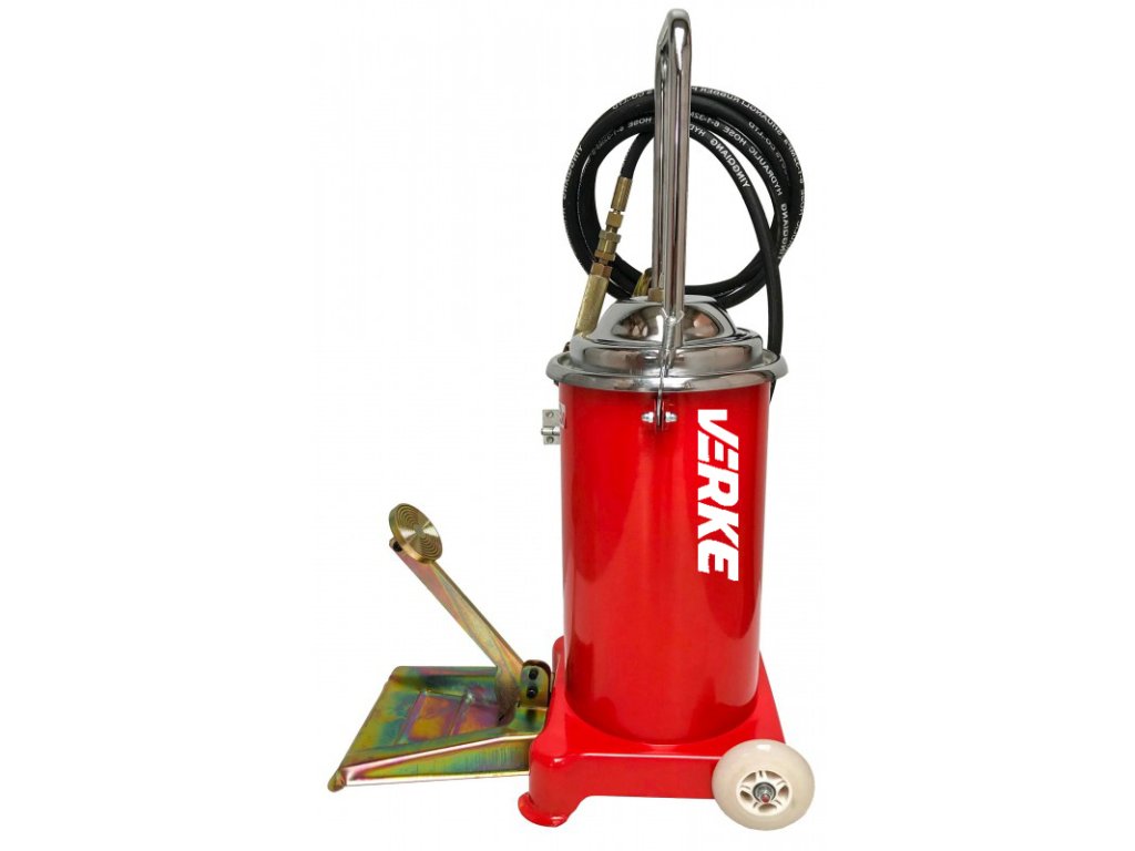 Profesionální nožní mazací lis značky Verke. Mazací lis Verke je zařízení určené pro tlakové mazání mechanických součástí jako jsou hřídele, čepy, ložiska, klouby atd. Vyrobeno je z ocelového válce o kapacitě 15 l, umožňujícího kontinuální a efektivní práci. Celý lis je vyroben z vysoce kvalitních materiálů odolných vůči dlouhodobému působení maziv a olejů. Všechna těsnění a ventily jsou zpracována s nejvyšší precizností a umožňují práci pod tlakem až 30 MPa. V balení jsou dvě koncovky – tuhá a flexibilní, které se hodí pro většinu maznic. Kolečka zajišťují mobilitu a snadný transport.
