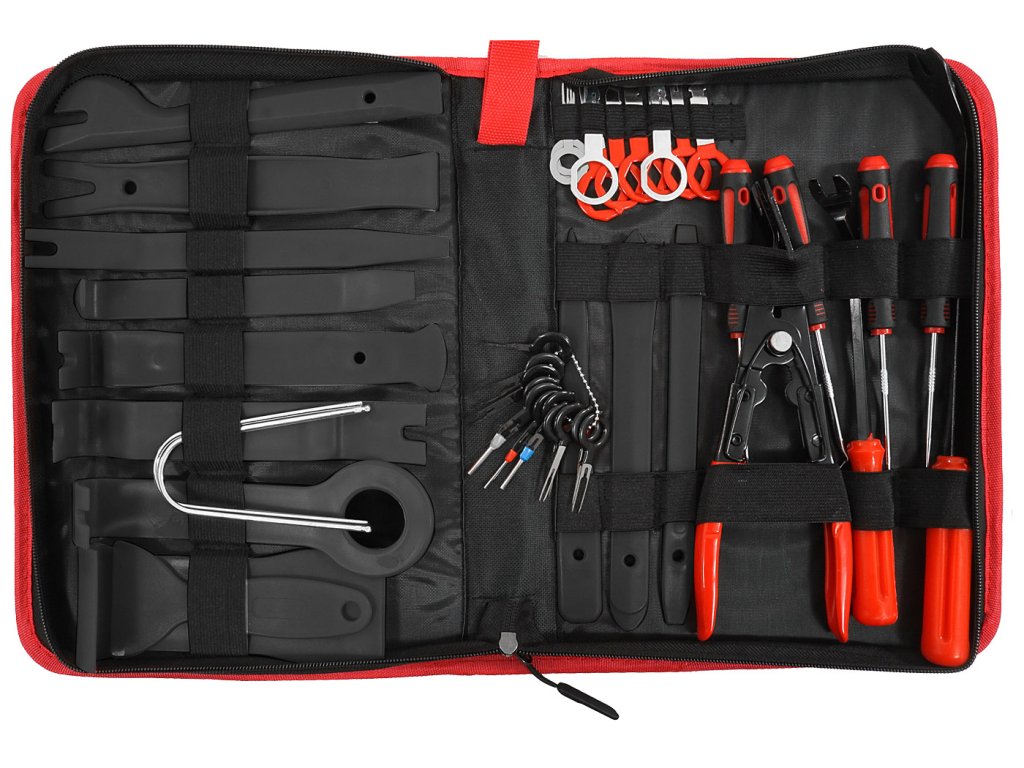 Speciální stahováky na demontáž čalounění a lišt v automobilu. Sada obsahuje 43 prvků, které umožňují rychlou demontáž čalounění z každého interiéru automobilu. Prvky sady jsou vyrobeny z tvrdého nylonu. Mají speciální profily, které umožňují použití páky při demontáži čalounických svorek. Velkou výhodou této sady je, že nezpůsobuje poškrábání na čalounění a lakovaných částech. Sada je doporučena pro použití v autoservisech, čalounických, karosářských a lakýrnických dílnách.