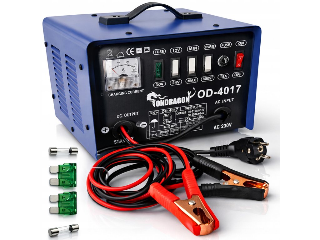 Profesionální nabíječka s funkcí startu je ideálním pomocníkem pro servisy, autodílny i domácí použití. Nabíjí olověné akumulátory s napětím 12V nebo 24V a zároveň dokáže podpořit rozběh motoru v případě vybití baterie či velmi nízkých teplot. Díky vysokému nabíjecímu proudu 90 A a podpoře kapacit až 300 Ah si hravě poradí i s většími akumulátory. Kvalitní kovová konstrukce s aktivním chlazením, vestavěný analogový ampérmetr a bezpečnostní pojistky z ní dělají spolehlivý nástroj pro každodenní práci.