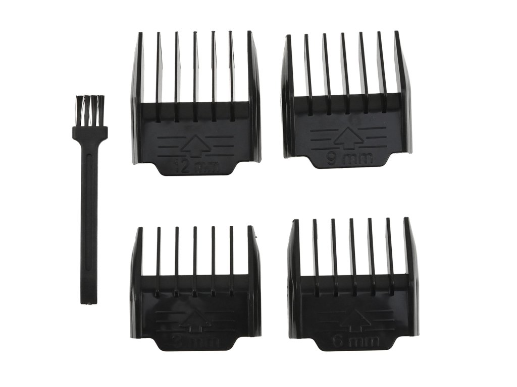 - 4 dodatečné nástavce, které zvyšují délku střihu o 3 mm, 6 mm, 9 mm a 12 mm