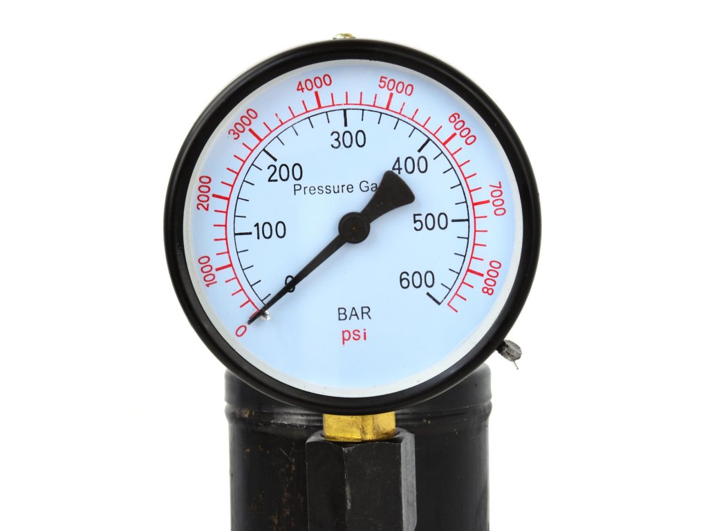- Manometr s dvojitou stupnicí v jednotkách bar a PSI: 0 - 600 bar / 0 - 8000 PSI