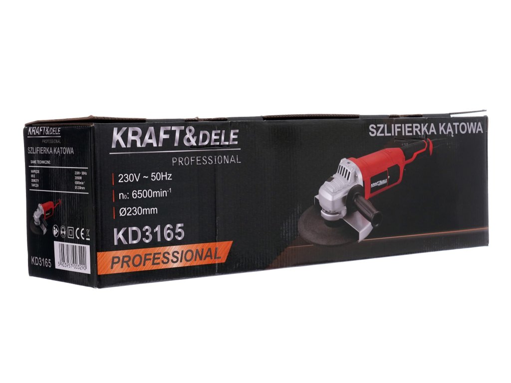 Elektrická úhlová bruska renomované značky Kraft&Dele, model KD3165, určená pro řezání, broušení a leštění materiálů jako dřevo, beton, plasty, keramika, kámen a mnoho dalších. Je vybavena motorem o výkonu 2950W, což umožňuje použití různého typu kotoučů, kartáčů a brusných disků.