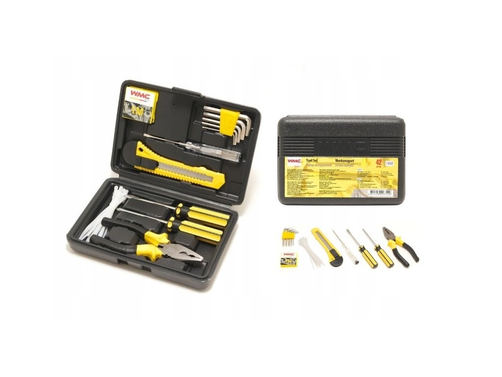 42dílná sada nářadí WMC je kompletní univerzální set, který obsahuje základní nástroje potřebné pro běžné montáže, opravy a údržbu v domácnosti, garáži, kanceláři i dílně.
