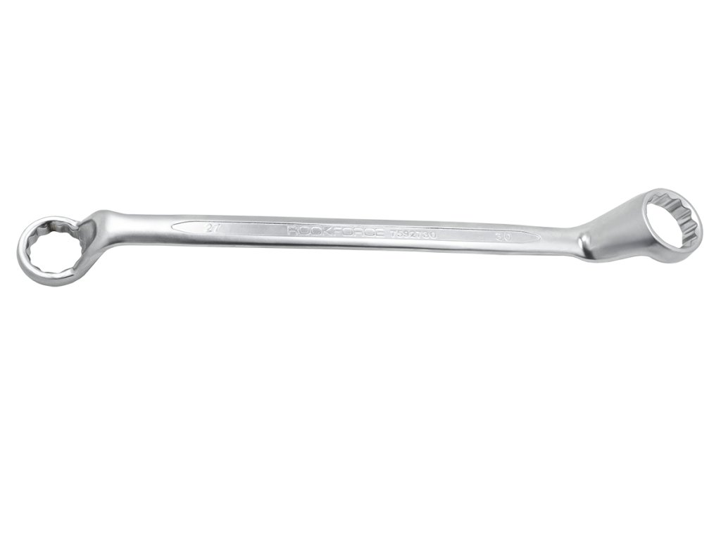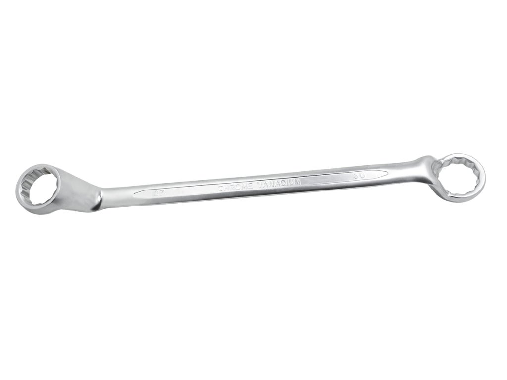Oboustranný zahnutý očkový klíč 27×30 mm, 75°, vyrobený z vysoce kvalitní chrom-vanadiové oceli, je ideální pro profesionální servisy a autoservisy i pro domácí dílny a garáže.